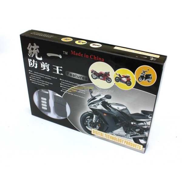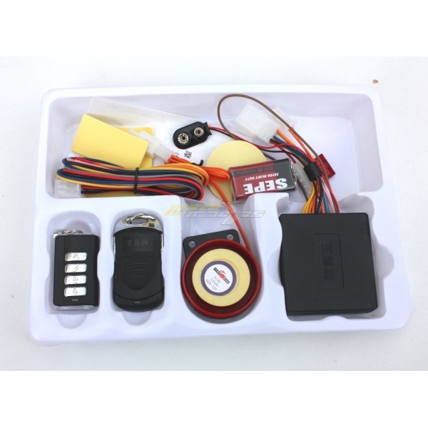 Univerzální alarm na motocykly, ATV a skůtry. Vhodný na většinu motocyklů. Napájení 12V, záložní zdroj. Siréna 120 db. Jednoduché zapojení. 2x klíček s dálkovím ovládaním.