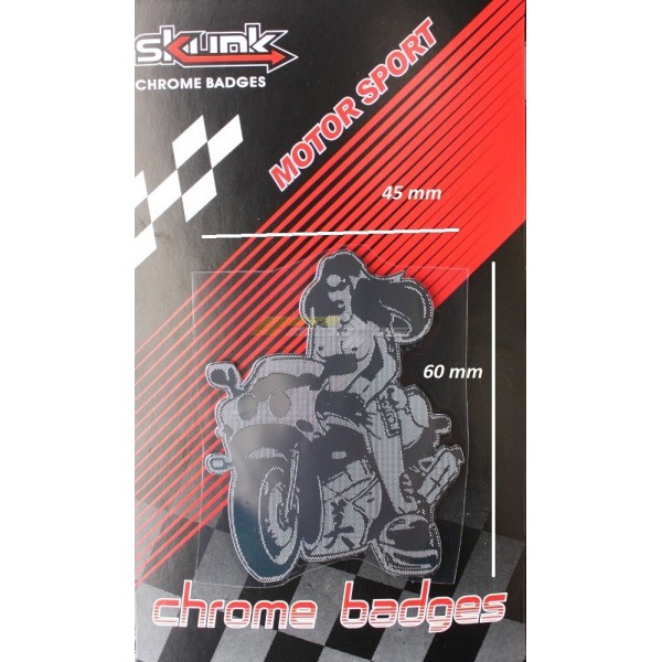Chromová, kovová samolepka na motocykly, logo MOTORKÁŘKA. Vhodná na černý podklad.