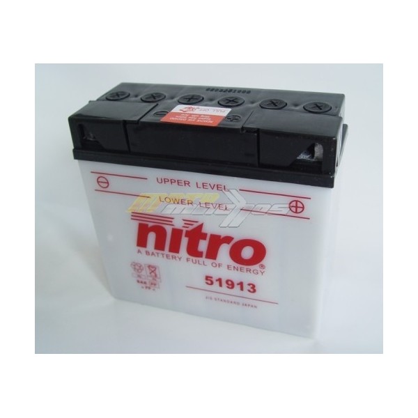 Klasická olověná baterie. Dodává se v suchém, nenabitém stavu. Pro uvedení do provozu je nutné ji naplnit elektrolytem do úrovně mezi rysky a poté nabít do plné kapacity. Upozornění: baterii nabíjíme maximálně 1/10 hodnoty jejího jmenovitého proudu, jinak hrozí její zničení!