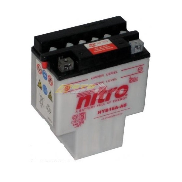 Klasická olověná baterie. Dodává se v suchém, nenabitém stavu. Pro uvedení do provozu je nutné ji naplnit elektrolytem do úrovně mezi rysky a poté nabít do plné kapacity. Upozornění: baterii nabíjíme maximálně 1/10 hodnoty jejího jmenovitého proudu, jinak hrozí její zničení!