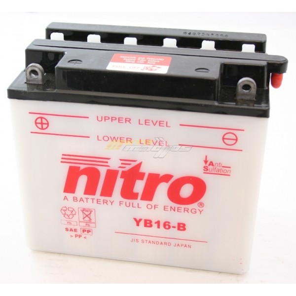 Klasická olověná baterie. Dodává se v suchém, nenabitém stavu. Pro uvedení do provozu je nutné ji naplnit elektrolytem do úrovně mezi rysky a poté nabít do plné kapacity. Upozornění: baterii nabíjíme maximálně 1/10 hodnoty jejího jmenovitého proudu, jinak hrozí její zničení!
