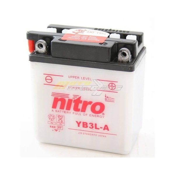 Klasická olověná baterie. Dodává se v suchém, nenabitém stavu. Pro uvedení do provozu je nutné ji naplnit elektrolytem do úrovně mezi rysky a poté nabít do plné kapacity. Upozornění: baterii nabíjíme maximálně 1/10 hodnoty jejího jmenovitého proudu, jinak hrozí její zničení!