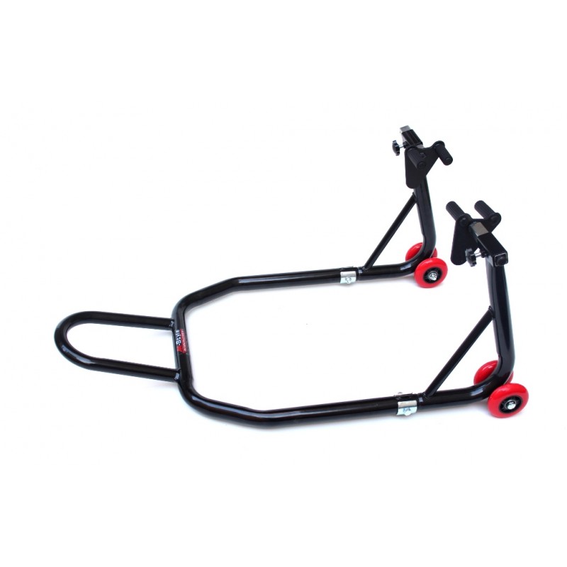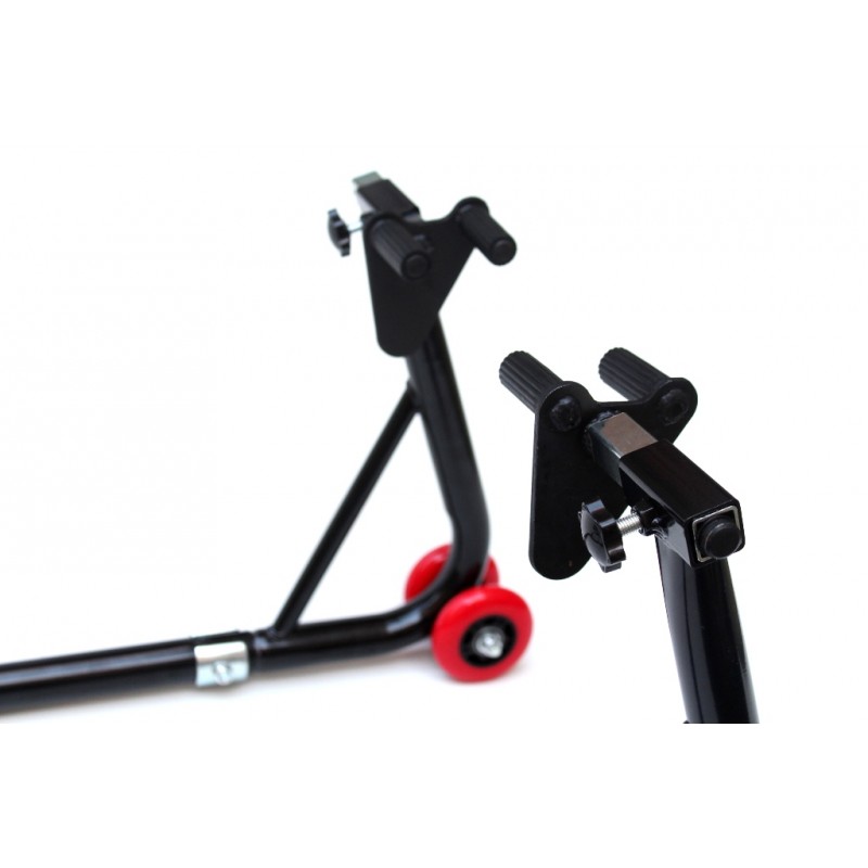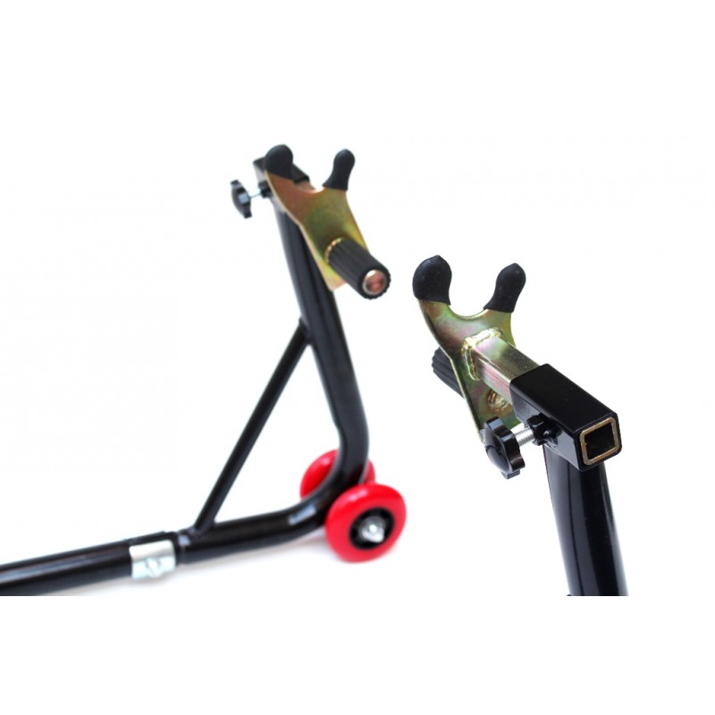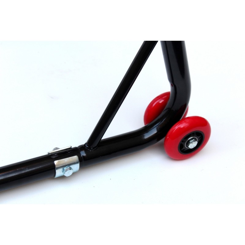 Univerzální motostojan pro přední kolo. Vhodné pro kutili a běžné použití. Robustní kontrukce, 4 kolečka. Materiál ocel. Cena za 1 ks včetně redukce pro zvednutí. Skladný a snadno rozmontovatelný.
