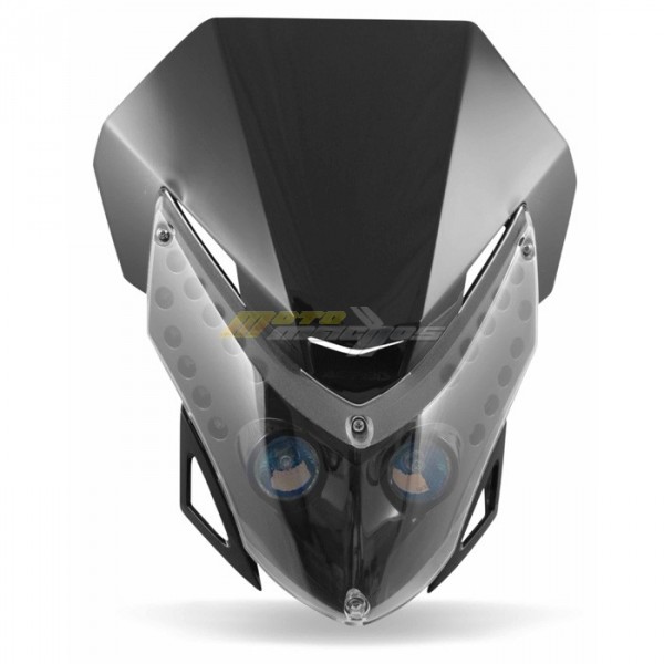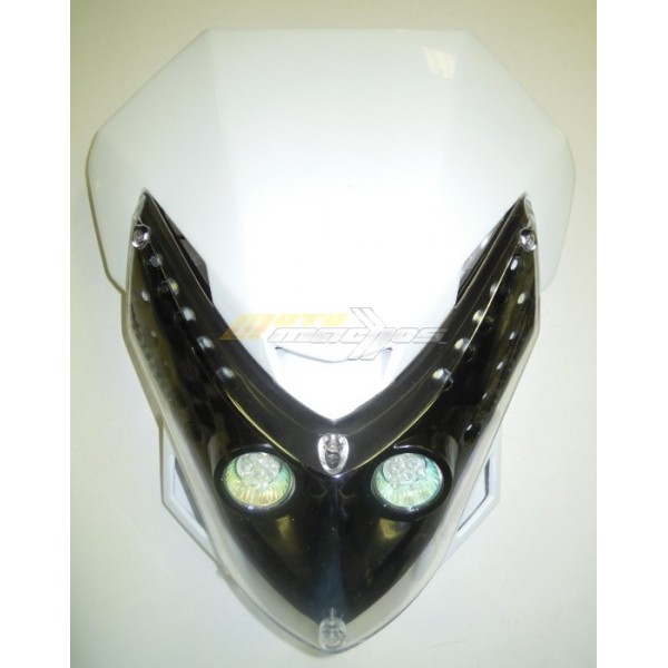 Přední street maska na motorku ALIEN.Maska má diodové boční denní svícení, přední žárovky LED 12V 3W svítivost 25W 240 lm.Provedení plast.Přichycení masky k motorce přes 4 gumové pásky.Rozměry šířka 29 cm, výška 33 cm. Cena za 1 ks.Příjemce :