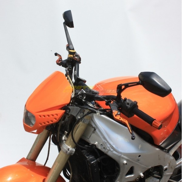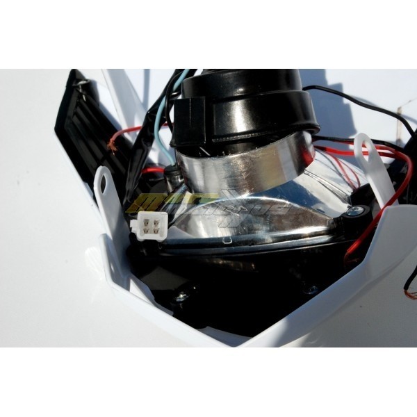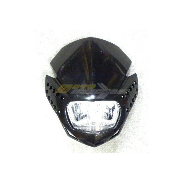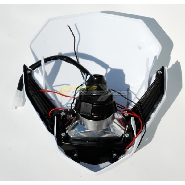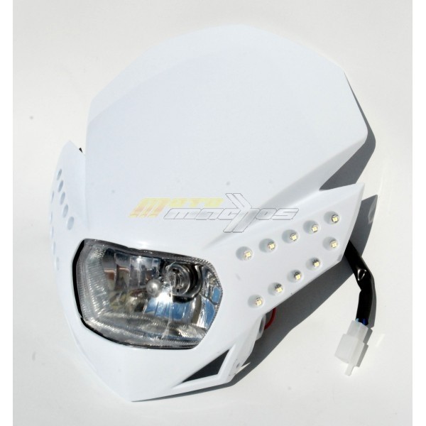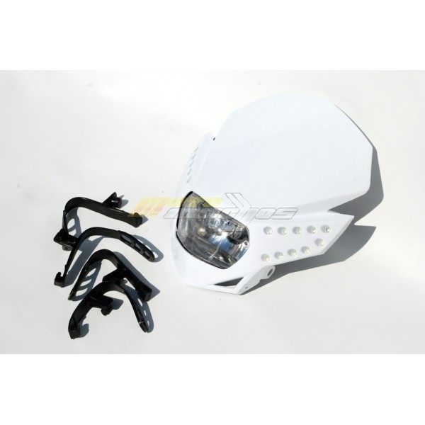 Motocyklová přední maska s čirou optikou a denním led svícením na motorku, street, enduro, nahače, kros. Provední plast, osazena žárovkou H4 12V 35/35W. Skvělá svítivost a perfektní design změní Váš motocykl.