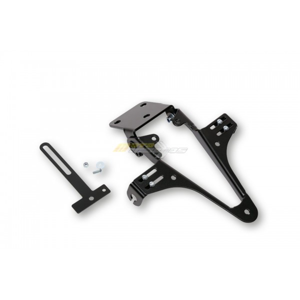 Univerzální držák pro SPZ motocyklů, nastavitelný sklon. Materiál Ocel. Světýlko pro osvětlení SPZ je vhodné - Kod produktu 256005. Cena za 1 ks.