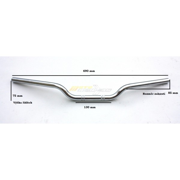 Chromová řidítka na motocykly, provedení nízké. Průměr řidítek 22 mm, šířka 690 mm. Materiál ocel, povrchová úprava Chrom. Díra pro závažíčka je 17 mm. Cena za 1 ks.