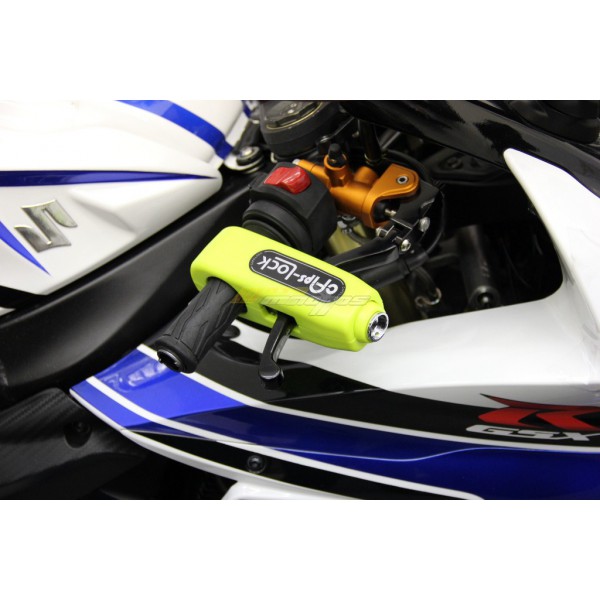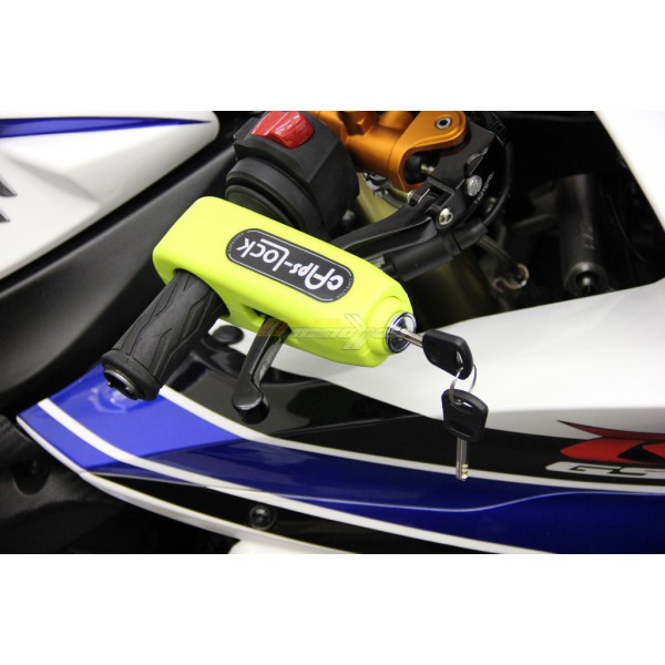 Univerzální zámek na motorku - Caps Lock. Uzamýká motocykl zmáčknutím brzdové páčky. Tvrzený bezpečnostní plast ketrý je vyztužen ocelovím drátem, 2 klíče, redukce pro průměr gripů. Cena za 1 ks.