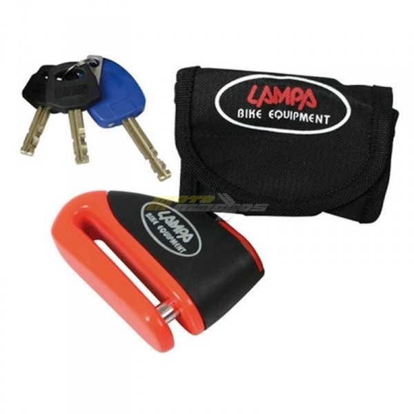 Motocyklový zámek na kotouč značky Lampa. Vysoce kvalitní materiál a provedení. V příbalu kapsa na zámek a 2 klíče+ lanko jako kontrola že máte zamčenou motorku. Průměr čepu je 10 mm, délka 104 mm, výška 68 mm.